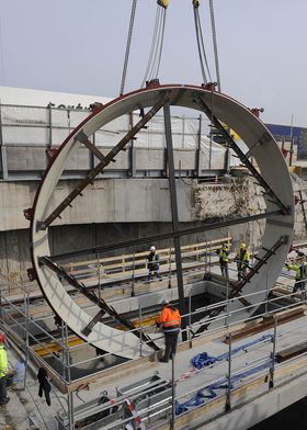 Werbung Rheinkraftwerk Iffezheim: Schwerlasthub auf der EnBW Wasserkraftbaustelle in Iffezheim Erneuerbare & Ökologie Ökologie Technik 9. März 2012 Hinweis: Die Bildrechte zu den Beitragsfotos finden Sie am Ende des Artikels EnBW Rheinkraftwerk Iffezheim Hub Mauerring / Bild: EnBW Platzierung des Mauerrings für die fünfte Maschine erfordert technische Präzisionsarbeit Stuttgart/Iffezheim. Auf der Wasserkraftbaustelle im Rheinkraftwerk Iffezheim schreiten die Arbeiten für den Einbau der fünften Maschine zügig voran. Von diesem Frühjahr an bis in den Herbst hinein wird die Maschinentechnik Stück für Stück in das fertig betonierte Maschinenhaus eingesetzt. Zur Befestigung der Maschinenteile wurde gestern ein 40 Tonnen schwerer stählerner Mauerring in die Hauptbaugrube eingehoben. An ihm wird der Leitapparat mit dem Laufradmantel für die fünfte Turbine montiert. Das Runde muss in das Eckige – unter diesem Motto stand die Platzierung des Mauerrings, der mit seinen rund zehneinhalb Metern Durchmesser durch eine viereckige Montageöffnung in die Maschinenhalle befördert wurde. Die besondere Herausforderung dabei: Die Öffnung misst nur neuneinhalb Meter in der Länge. Es erforderte also genaues Rechnen bei der Planung und Präzisionsarbeit beim Hebevorgang, um den Mauerring im richtigen Winkel in die Baugrube einzubringen. Dann wurde er passgenau in die vorgesehenen Betonnischen des Bauwerks zwischen Turbinengehäuse und Saugrohrpanzerung eingehoben und an einbetonierten Ankerplatten angeschweißt Damit sind die Vorbereitungen getroffen, um die nächsten Teile in der Baugrube zu befestigen: Der Mauerring wird den Leitapparat und den Mantel des Laufrads halten. Sie sollen in den nächsten Wochen auf der Baustelle ankommen. Sind sie montiert, wird der Mauerring fest in der Wand einbetoniert, um den gewaltigen Kräften des Rheinwassers standzuhalten. Seit 2009 baut die EnBW Kraftwerke AG im Rheinkraftwerk Iffezheim eine fünfte Maschine in die bestehende Anlage ein. Mit 38 Megawatt installierter Leistung wird sie ab 2013 Strom für zusätzlich rund 75.000 Menschen jährlich produzieren. Damit wird das Rheinkraftwerk das größte Laufwasserkraftwerk in Deutschland sein und mehr als eine halbe Millionen Menschen im Jahr mit CO2-freiem Strom aus Wasserkraft versorgen. PM: EnBW Weitere Beiträge:DirectIndustry startet die ersten iNOVO-AwardsWegen steigender CO2-Emissionen: Neste fordert Zulassung erneuerbaren DieselsHintergrundpapier soll Wissenslücke über Schwachstellen im Gasnetz schließen