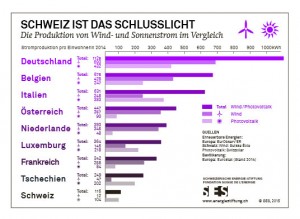 Werbung Neue erneuerbare Energien: Schweiz hinkt der EU hinterher Erneuerbare & Ökologie Solarenergie Windenergie 23. Mai 2015 Hinweis: Die Bildrechte zu den Beitragsfotos finden Sie am Ende des Artikels Die Schweiz hinkt der EU bei der Sonnen- und Windstromproduktion um Jahre hinterher. (WK-intern) – Die europäischen Länder produzierten 2014 im Durchschnitt 5,7 mal mehr grünen Strom. Ein Vergleich der SES bringt weitere enttäuschende Fakten ans Licht: Alle neun umliegenden Staaten erzeugen mehr Strom aus Sonne und Wind und selbst unter sämtlichen 28 EU-Ländern liegt die Schweiz auf dem viertletzten Rang. Das ist ein Weckruf für die ParlamentarierInnen der Energiekommission des Ständerats, die am 27. Mai 2015 über die Förderung erneuerbarer Energien im Rahmen der Energiestrategie 2050 beraten. Die SES fordert die Aufhebung der Obergrenze des Netzzuschlags für die kostendeckende Einspeisevergütung (KEV). Die Schweizerische Energie-Stiftung (SES) vergleicht die Photovoltaik- und Windstromproduktion 2014 der EU-Länder mit der Schweiz1. Um die Grössenunterschiede der Länder zu berücksichtigen, wird die Stromproduktion pro EinwohnerIn betrachtet. Im Vergleich mit neun umliegenden Ländern ist die Schweiz abgeschlagen auf dem letzten Platz (siehe Grafik). Selbst wenn man alle 28 EU-Staaten miteinbezieht, landet die Schweiz auf Rang 26. Nur gerade die Slowakei, Ungarn und Lettland sind grössere Erneuerbaren-Muffel. Im Durchschnitt produziert die EU pro Einwohner 5,7 mal mehr Strom aus Wind und Sonne als die Schweiz. Sonne mit viel Potential Dass Hopfen und Malz noch nicht verloren ist, zeigt das Steigerungspotential der Sonnenenergie. Seit 2010 konnte die Schweiz die Stromproduktion aus Photovoltaik von 10 auf heute 104 kWh pro Kopf mehr als verzehnfachen. Doch auch europäische Staaten geben Gas: Bulgarien, das vor vier Jahren noch kaum Photovoltaikanlagen hatte, konnte seine Produktion von 2.1 KWh auf 172 KWh gar um das 82-fache steigern. Sogar das von Krisen gezeichnete Griechenland weist einen relativen Wachstumsfaktor von 27,6 auf. Tschechien, das deutlich weniger Sonnenstunden verzeichnet als die Schweiz, konnte nochmals zulegen und produziert beinahe das Doppelte, nämlich 202 kWh pro EinwohnerIn. Dänemark brilliert Den höchsten absoluten Zubau in den letzten vier Jahren (+762 kWh pro EinwohnerIn) kann Dänemark verzeichnen. 2014 brilliert das Königreich auf dem europäischen ersten Rang mit einer Produktion von 2’165 kWh pro Kopf aus neuen Erneuerbaren. Immerhin ist die Schweiz beim absoluten Zubau im letzten Jahr mit 37 kWh pro Kopf ins europäische Mittelfeld aufgestiegen (Rang 16). Rumänien kann jedoch im selben Jahr einen Zuwachs von bravourösen 131 kWh pro Person verzeichnen. Aber auch andere EU-Länder setzen die Energiewende erfolgreich um. An Europas Spitze stehen Dänemark (2’165 kWh/Kopf), Spanien (1’276), Portugal (1’240), Deutschland (1’125), Schweden (1’096) und Irland (1’064). Nachbarn hängen uns ab Vergleicht man nur unsere umliegenden neun Länder, sticht Deutschland vor Belgien und Italien hervor. Unser nördlicher Nachbar produziert 4,2 mal mehr Strom aus Photovoltaik, 55,8 mal mehr Strom aus Windkraft und insgesamt knapp 10 mal mehr Strom aus diesen beiden wichtigsten Technologien für die Energiewende. Österreich, mit ähnlicher Bevölkerungszahl wie die Schweiz und ebenfalls ein Binnenland, erzeugt fast 30 mal mehr Windstrom pro EinwohnerIn als die Schweiz. Ständerat gefordert Die gesamteuropäische Entwicklung zeigt, dass die Energiewende schon Realität ist. Die Schweiz als Wohlstandsinsel und fitte Wirtschaftsnation zeigt sich zwischen den EU-Ländern hingegen von einer wenig schmeichelhaften Seite. Es besteht grosser Aufholbedarf bei der Nutzung von Wind- und Sonnenstrom. Die wirtschaftlichen Vorteile – neue Arbeitsplätze und inländische Wertschöpfung – sind eine Chance, die wir nutzen sollten. Am 27. Mai wird sich die Ständeratskommission für Umwelt, Raumplanung und Energie (UREK-S) zur Energiestrategie 2050 beraten. Die SES fordert die ParlamentarierInnen auf, für die Förderung von zukunftsfähigen Technologien und Energieeffizienz endlich grünes Licht zu geben. Die kostendeckende Einspeisevergütung (KEV) entfaltet ihre volkswirtschaftlich positive Wirkung dann optimal, wenn die Fördergelder nicht gedeckelt sind. Bundesrat und Nationalrat schlagen als Obergrenze 2,3 Rp./kWh vor – damit lässt sich die Warteliste nicht abbauen. Die SES fordert den Ständerat auf, die Deckelung der KEV aufzuheben. PM: SES Weitere Beiträge:Wasserstoff-BHKW einer Power-to-Gas-Kette wird zum BHKW des Monats Oktober gekürtAtomstrom aus Norddeutschland blockiert die StromleitungenEröffnung des 8. Windkunstfestivals „bewegter wind“