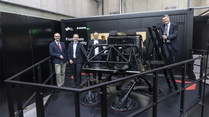 Werbung Teststand 28. Januar 202628. Januar 2026 PB: V.l.: Arno Eichberger (Institut für Fahrzeugtechnik der TU Graz), Martin Peter (Vice President Magna Vehicle Engineering), TU Graz-Rektor Horst Bischof und Severin Stadler (Director Adv. Engineering, Cooperations & Strategy, Magna) bei der Eröffnung des Advanced Driving Simulation Centers / ©: Lunghammer – TU Graz