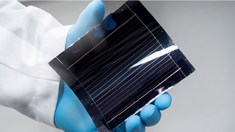 PB: Eine Solarzelle aus Perovskit. Die Dünnschichttechnologie ermöglicht die Herstellung von leichten und flexiblen Solarzellen. Dank der zweischichtigen Tandem-Konstruktion können sie zudem mehr Licht einfangen als herkömmliche Silizium-Zellen. Bild: Empa